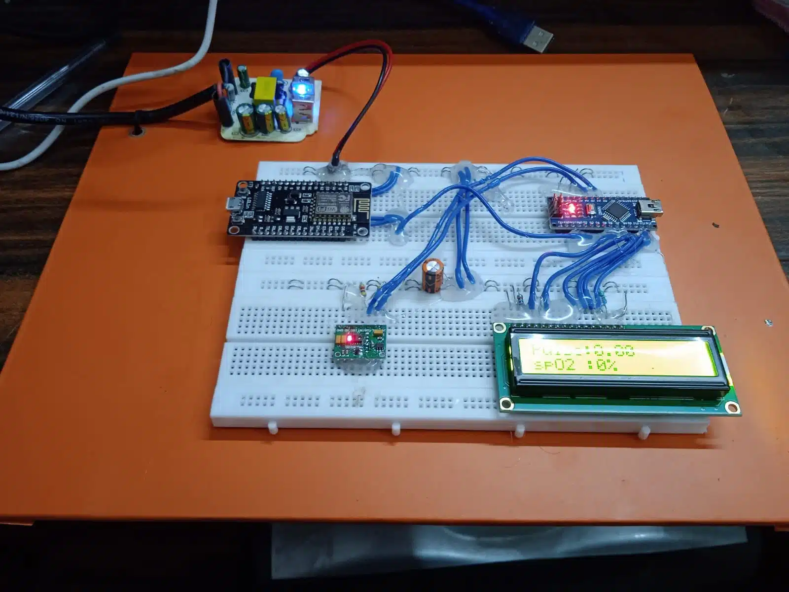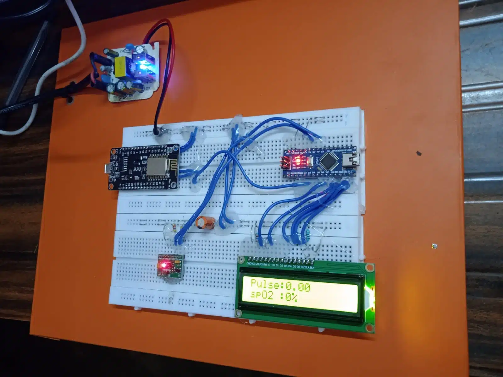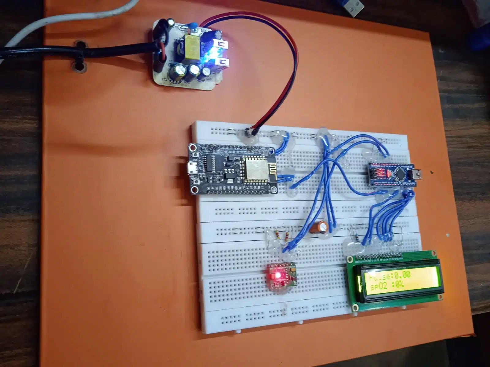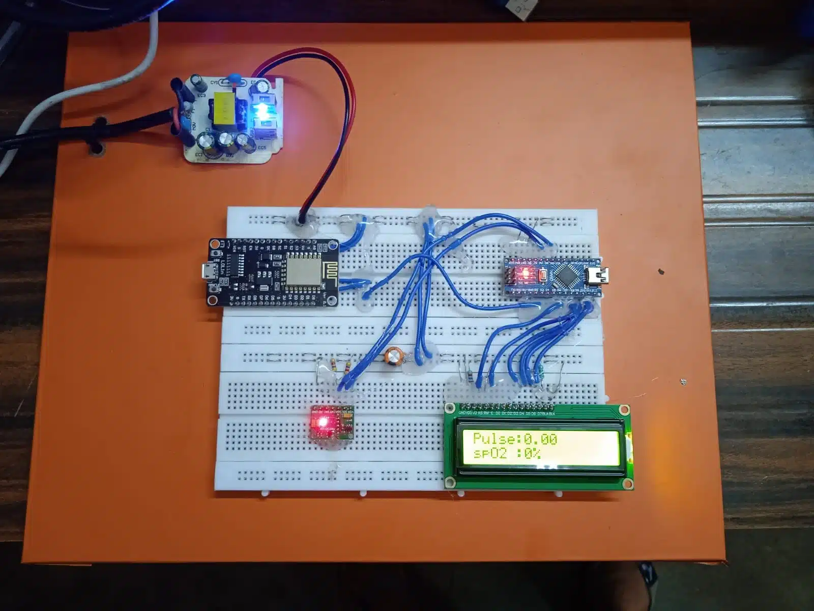 A 16×2 character LCD is used to display the measured pulse rate and SpO2 values in real-time. This allows local monitoring of the data.