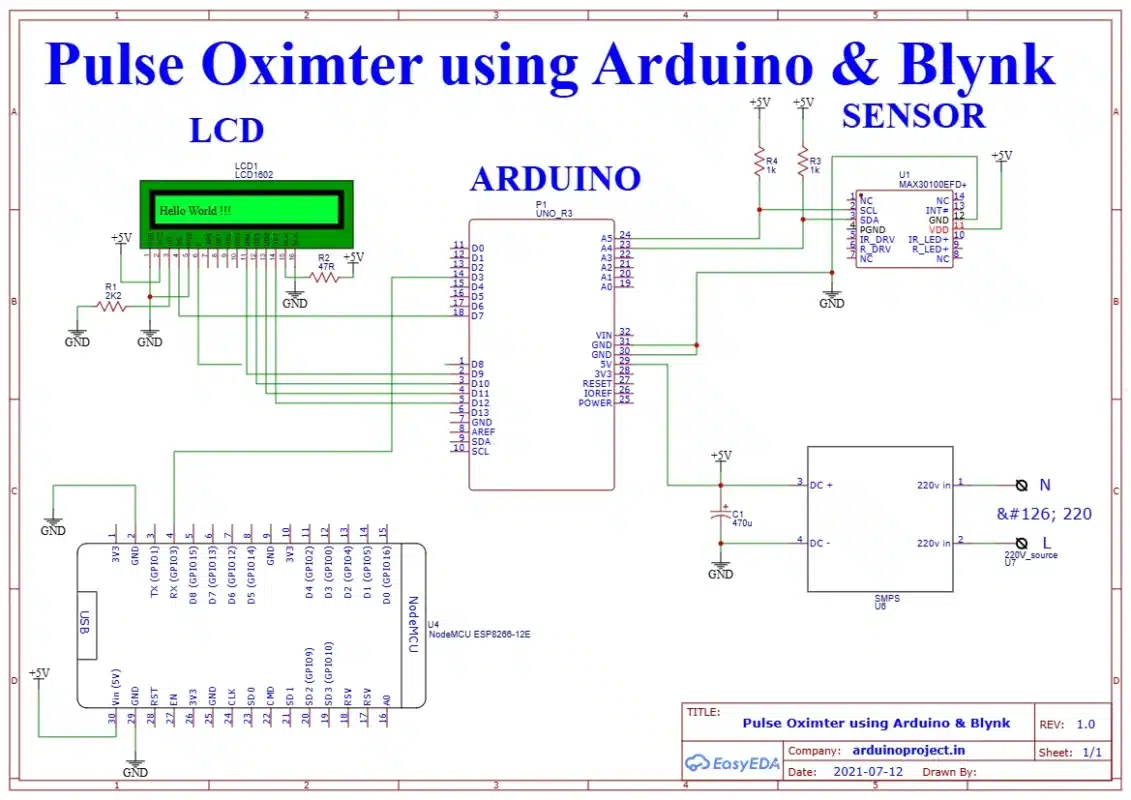 The advancement in embedded systems and IoT (Internet of Things) has revolutionized the healthcare industry. One such innovation is the development of compact and portable health monitoring systems. This report outlines the development of a health monitoring project using the Arduino microcontroller with the MAX30100 pulse oximeter sensor, which reads a person’s pulse rate and SpO2 (blood oxygen saturation) levels. The data is displayed locally on an LCD and transmitted wirelessly to the Blynk app via a Wi-Fi module, making real-time remote monitoring possible. The system is powered using a 5V DC power source.