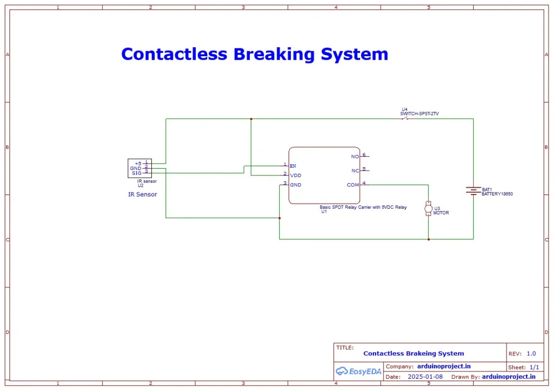 In this project, we have designed a Contactless Breaking System utilizing an IR sensor module and a relay module. The primary objective is to create a system that can automatically stop a motor when an object (in this case, a human hand) comes near the IR sensor. The system operates on a 7.4V DC supply, powered by two 18650 batteries connected in series to deliver 3.7V each. The IR sensor detects the proximity of a hand, generating a logic signal that controls the relay, which, in turn, powers off the motor.