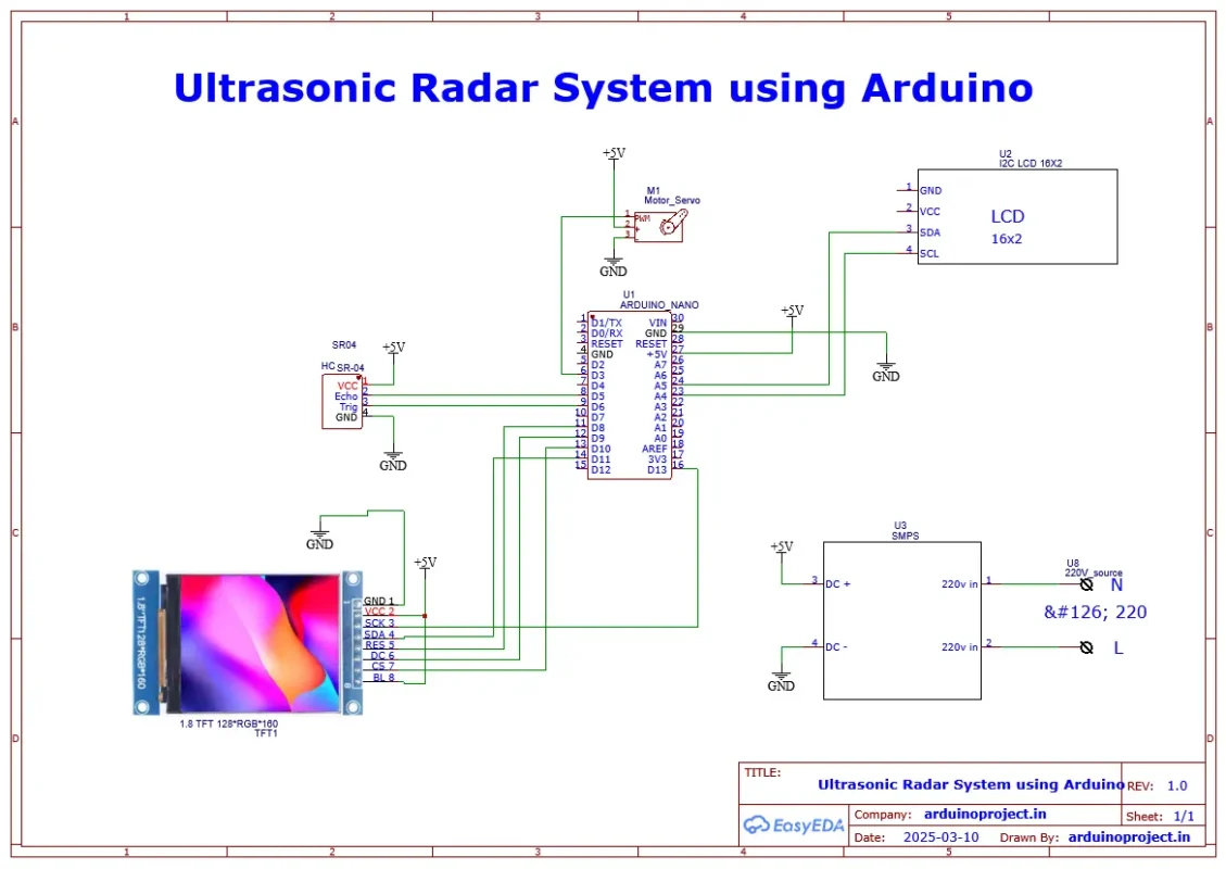 Radar technology is widely used for detecting and tracking objects in various fields, such as defense, security, and automation. This project replicates the working of radar using an ultrasonic sensor and Arduino. The objective is to scan an area within a 20 cm range and determine the presence of an object, its distance, and the angle at which it is detected. The scanning effect is visually represented on a TFT LCD, providing an intuitive understanding of the detected object’s position.